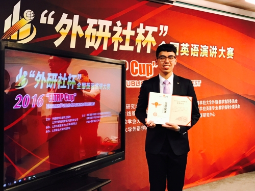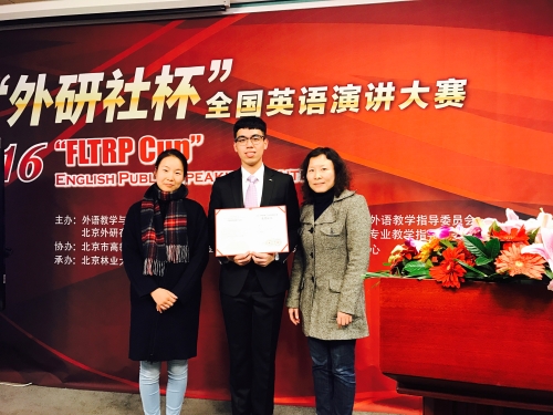 2016年11月5日,2016年“外研社杯”全国英语演讲大赛北京赛区复赛在北京林业大学拉开帷幕。英语系本科二年级学生唐杰代表我院参加了比赛,与来自北京几十所高校的55名优秀选手同台竞技,取得了特等奖的优异成绩,从高手林立的北京赛区突围,成功晋级全国总决赛。