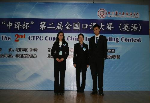 中译杯第二届口译大赛北京地区复赛于3月24日在北京第二外国语大学举行。该赛事由中国翻译协会主办,共有来自北京二十所高校的80位选手参加了比赛,其中包括清华大学、北京大学、北京外国语大学、北京语言文化大学等。我院英语系共选拔了三位选手参赛:费瑶、李杨和郝爽。其中费瑶和李杨同学包揽了比赛的一等奖,郝爽同学获得二等奖。特此向三位同学表示祝贺,并向参与培训辅导的英语系老师们表示感谢。