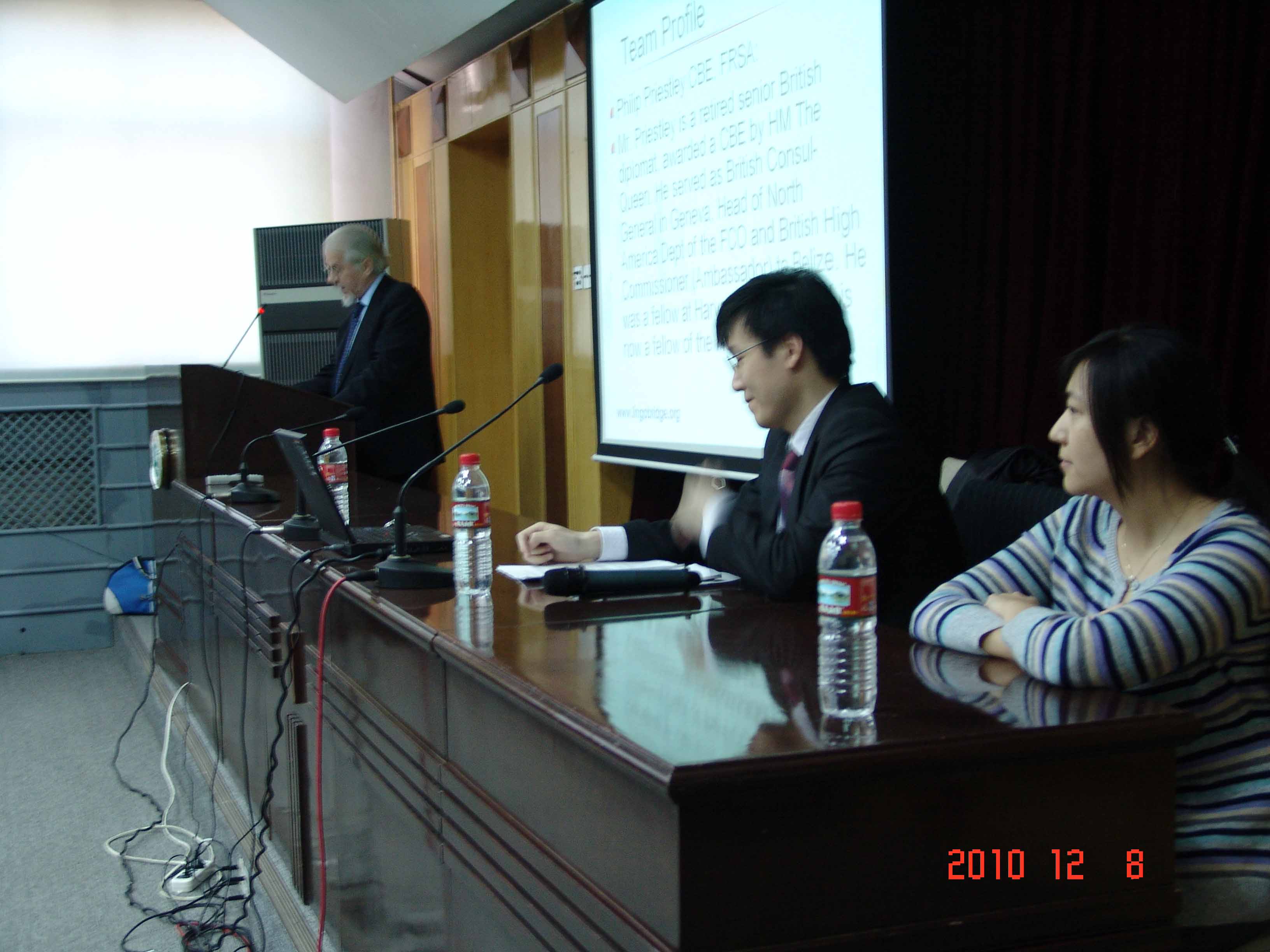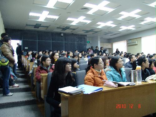 2010年12月8日下午5点至7点,由英语系教学副主任梅琼副教授主持,英国资深外交官Mr. Priestley携手译联国际学术总监蔡勇刚先生,共同在419报告厅成功地为外交学院英语系100多名本科生及研究生呈现了一场名为“浅谈译员职业素质的塑造和培养”的讲座。该讲座独特地从口译客户、用人单位和在职译员三方视角解读译员职业性的塑造和培养,旨在提示并帮助学生将学到的口译技巧升华为译员技能,从而缩短学生离校后成长为职业译员所需的“破茧期”。讲座直指口译认识误区,并有现场模拟练习。讲座举行期间,偌大的419报告厅内座无虚席,甚至有许多同学站着听讲。此次讲座受到了到场师生的一致好评。