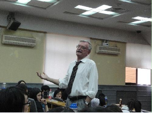 2012年4月18日下午,外交学院英语系邀请尼古拉斯·奥努夫(Nicholas Onuf)教授为英语系和外交学系部分师生作了主题为“崛起与衰落”的讲座。尼古拉斯·奥努夫教授从世界发展大背景出发,就人类未来、社会性质、社会结构和中美力量对比与大家分享了自己的想法,也引发了大家的思考。讲座深入浅出,风趣幽默,轻松自然。