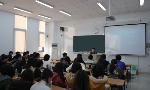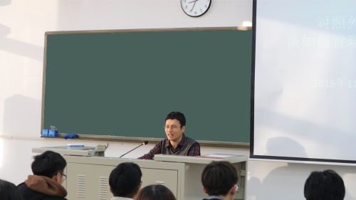 2016年11月28日上午,外交部翻译司高级翻译、英语系系友张宁在我院沙河校区教学楼221教室举办了题为“对照外交翻译工作谈如何管理自己的大学生活”的讲座。张宁从学习、生活等各个方面,系统、详细地向同学们讲述了翻译专业的学习方法以及外交部翻译工作的各种经验,强调积极主动管理自己大学生活的重要性。