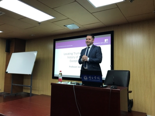 2018年3月20日上午,英国利兹大学国际关系学教授杰森·拉尔夫(Jason Ralph)应英语系美国社会文化研究中心的邀请,在外交学院沙河校区行政楼4012报告厅做了题为《在美国例外主义的悠久历史中寻找特朗普》(Locating Trump in the Long History of American Exceptionalism)的讲座。讲座由英语系主任石毅教授主持,英语系部分教师、研究生和本科生参加。