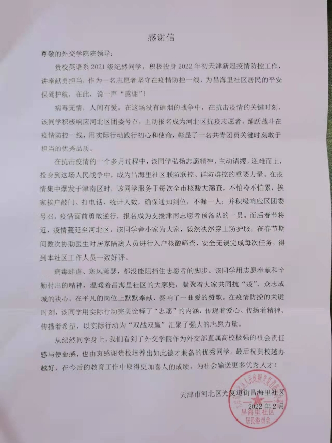 2022年初天津新冠疫情出现反弹,我系2021级翻译专业纪然同学积极响应号召,主动报名河北区抗疫志愿者,战斗在疫情防控一线。纪然同学的无私奉献精神和兢兢业业的工作态度展现了英语系学子的优良品德和使命感,受到天津市河北区光复道街昌海里社区的一致好评。