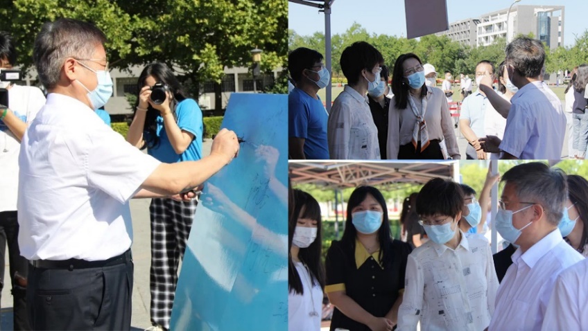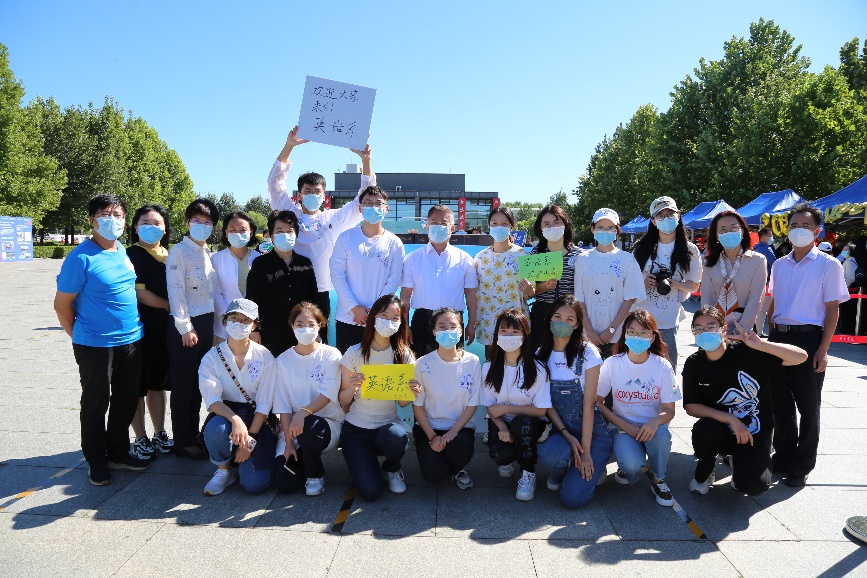 上午10时许,在学生处处长王胜乾老师的陪同下,党委书记崔启明、副院长孙吉胜、副院长李洪梅以及党委副书记董杰等院领导来到英语系迎新展台前,详细询问了各项迎新工作进展情况,并与报到的新生亲切交谈、合影留念。