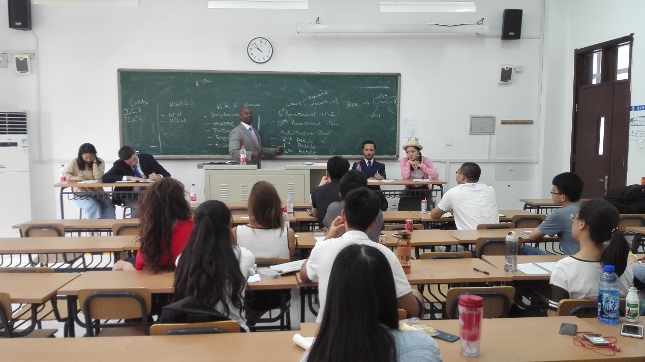 罗林斯学院代表团还应邀走进了英语系的《英语辩论》课堂,美国辩论队员们坐在辩论课同学们之中,互动频繁。罗林斯代表团领队Eric Smaw 教授为《英语辩论》课的同学们做了一场生动的讲座,系统介绍了国际法辩题的背景与分析思路,并引用美国跨国公司UNICOL的案例使抽象问题具体化,深入浅出,生动形象。随后,在Smaw教授的提议下,《英语辩论》课的学生与罗林斯辩论队队员交叉组队,针对讲座所学内容进行了相关辩题的简短英国议会制辩论展示,双方学生灵活运用所学知识,展示了中美辩论独特的风格,令人印象深刻。