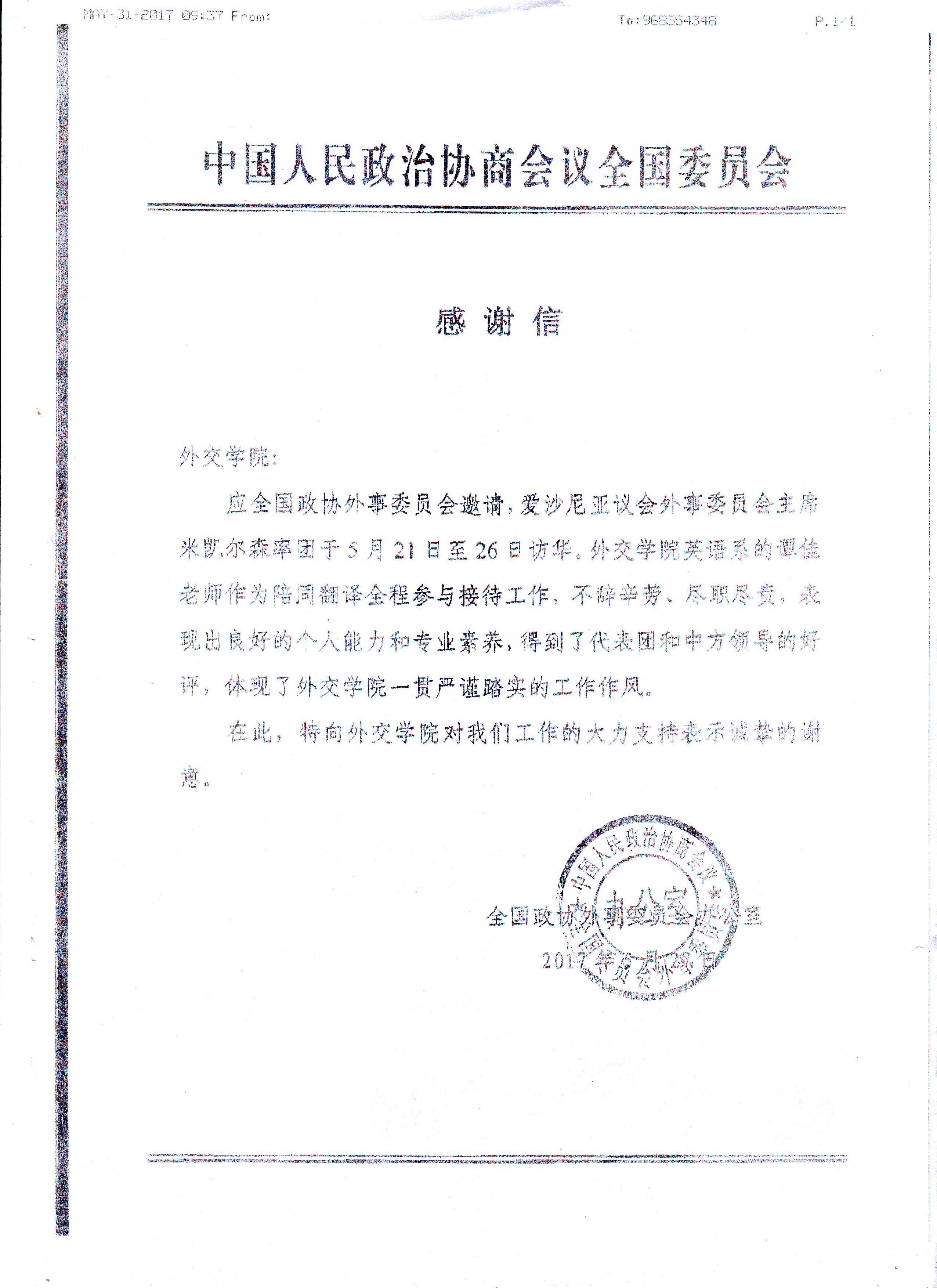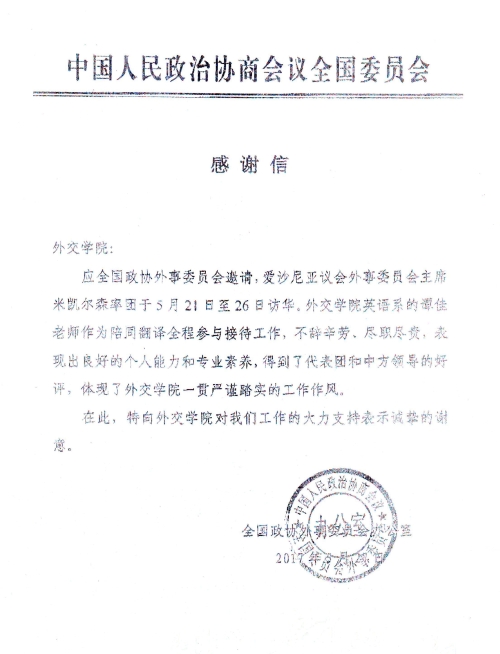 受全国政协邀请,2017年5月21日至26日,英语系谭佳老师担任爱沙尼亚议会外委会访问团翻译。访问期间,代表团拜访了全国政协、外交部、中联部,与全国政协、外交部欧洲司相关负责人就推动双方机构交往,加强双边友好合作和中欧关系、中美关系等议题交换了意见。代表团于5月23日至25日期间访问重庆,参观了重庆寸滩保税港区、电子科技园等重点示范项目,与重庆市政协相关负责人亲切会谈。