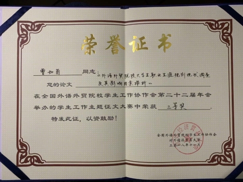 2018年11月1日至2日,全国外语外贸院校学生工作协作会第二十二届年会在对外经济贸易大学召开,本届年会以“新时代学生工作机制与质量提升”为主题。英语系辅导员曹如茵老师提交的论文《外语外贸院校大学生职业生涯规划现状调查及其影响因素探析》在年会征文比赛中荣获三等奖。在此,特向曹如茵老师表示热烈祝贺!