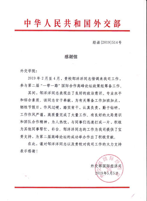 英语系青年教师邹洋洋于2019年2月至4月被借调到外交部国际经济司,参与第二届“一带一路”国际合作高峰论坛政策组筹备工作。工作期间,邹洋洋老师认真负责,甘于奉献,踏实肯干,高质量完成了大量工作,为第二届高峰论坛的成功举办作出了积极贡献。外交部国际经济司特向我院发函表示感谢!