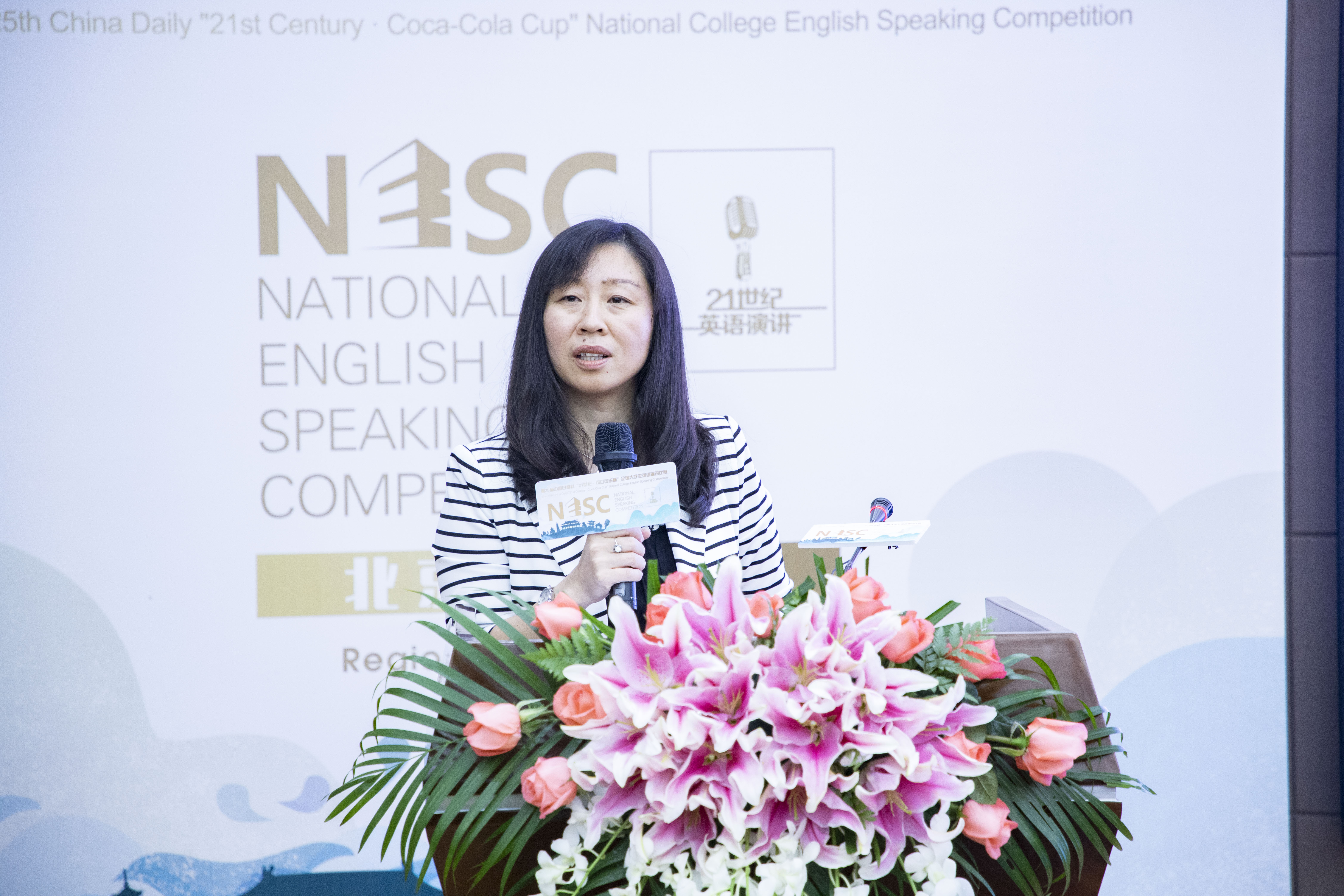 英语系主任石毅教授为大赛致辞。她回顾了外交学院与“21世纪杯”全国大学生英语演讲比赛的合作历程,对本届比赛北京赛区决赛在外交学院成功举办表示热烈祝贺。石毅教授简要介绍了外交学院英语系在学生英语演说和辩论能力培养方面所取得的成绩,感谢该平台为全国大学生展示英语风采提供了宝贵的机会,并希望外交学院能与中国日报社和各兄弟院校一起助力中国外语教育,为国家输送更多优秀外语人才。