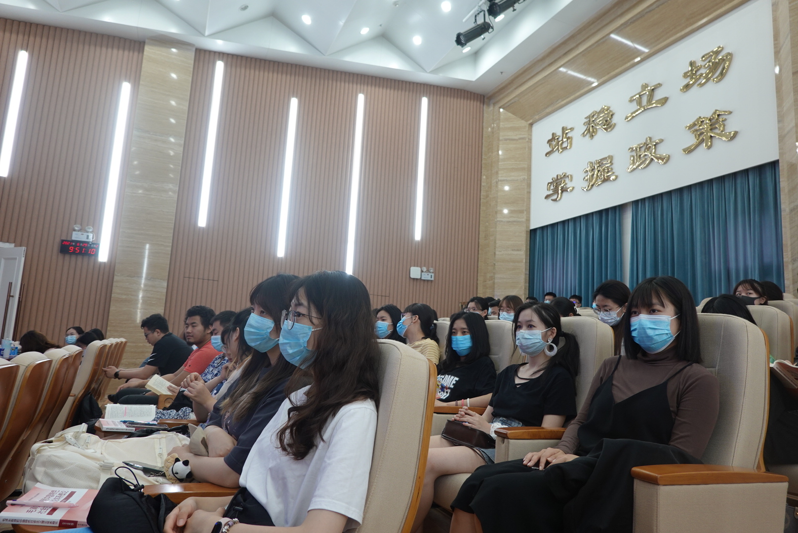为加强对联系院系学生的思想政治引领,提高学生的家国情怀,拓宽其专业素养和学术视野,孙吉胜副院长于2021年6月29日上午在沙河校区图书馆报告厅为英语系2019级全体学生专题授课,课后与2019级外交翻译专训班同学们进行了座谈。授课由英语系党总支书记季玲老师主持,系主任冉继军教授出席活动并主持学生座谈会,教学副主任杨强副教授、美国研究教研室副主任和媛媛老师以及团总支书记兼辅导员曹如茵老师参加了专题授课及座谈会。