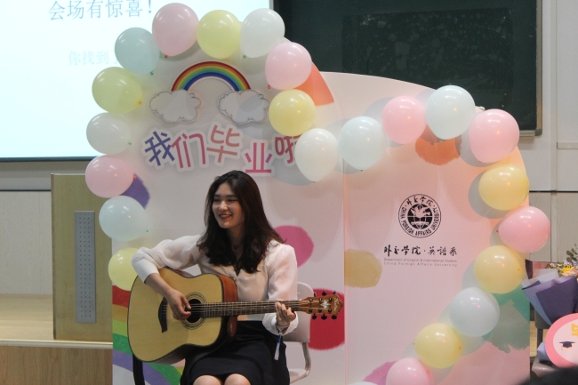 毕业晚会的最后,钟一宁同学为大家带来吉他弹唱《那些花儿》。伴随“我们就这样,各自奔天涯”的歌词,毕业班同学们再次深深地感受到,外交学院英语系这一纽带将永远把师生联系在一起,永不分离。此去繁花似锦,以至来日可期。在场师生们情不自禁一起哼唱,在悠扬的合唱声中,本次毕业晚会圆满结束。