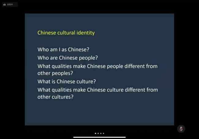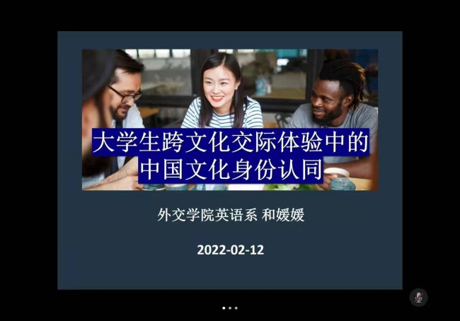 讲座以和老师于2021年发表的“跨文化交际体验中的中国文化身份认同:对中国大学生的中国文化观的话语分析”论文的研究过程为脉络,先后讲解了大学生对中国文化的身份认知的定义与面临的危机、文化身份认同的特点、不同因素对于文化身份认同的影响等。和老师采用定性研究的方法,收集了北京高校39名大学生关于关键性跨文化交际事件的反思报告,通过对反思报告的话语分析揭示了大学生对“中国文化”理解方式的多样性和流动性,旨在使中国当代大学生逐渐认识到文化身份认同的重要性,其研究结果对 “文化认同危机”的主题讨论具有重要的意义。