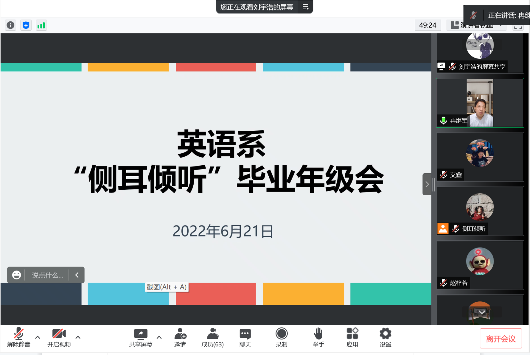 2022年6月21日晚,英语系召开了全体毕业生线上 “侧耳倾听”年级会。本次会议由英语系系主任冉继军老师主持,系党总支书记李淑媛老师、系教学副主任杨强老师、系教学副主任徐然老师、行政副主任汤华老师、系办公室主任(兼辅导员)艾鑫老师参加了本次会议。全体2018级毕业生们在会上与老师们进行了充分的交流。