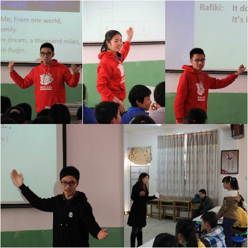 于是同学们开始调整原先准备好的上课内容,争取给孩子们上一堂生动有趣又具有启发性的英语课。同学们力求完美,反复修改公开课课件,使之内容更加优化、形式更加丰富,课堂节奏更顺畅。他们连续几天工作到深夜,最终确定上课的形式包括猜填字游戏、电影配音、学唱英文歌曲以及语言拓展等。填字游戏让孩子们忘记羞涩,活跃起来;英语配音让他们知道了英语可以如此精彩;一首You and Me的英文歌曲让收获知识的喜悦在歌声中传递;最后语言拓展部分教给了孩子们用多种语言表达爱。在课堂的结尾,同学们用自制的视频向孩子们展示了外交学院多姿多彩的大学生活,在他们的心中种下了一颗向往大学生活的种子。英语公开课不仅带给孩子们知识,也吸引了这三所中学的领导和老师们前来旁听。