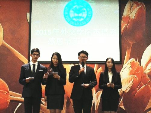 2015年11月25日,英语系于感恩节前夜,在沙河校区咖啡厅举行“感谢有你”班歌比赛。本次活动由英语系学生会组织,得到了英语系沙河校区三个年级12个班级同学们的热烈回应与积极参与。英语系党总支书记胡水娟老师,英语系辅导员曹如茵老师、英语系和媛媛老师、谭佳老师,刘冰老师、学院合唱队前任部长廉雅雯同学、现任副部长翟悦竹同学受邀担任评委。当晚,声声感谢与祝福化作一串串美妙的音符充盈着整个校园,温暖着这个冬日。
