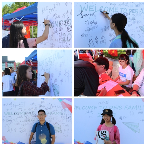 2019年8月30日上午7时,英语系于沙河校区伟人广场开展2019年迎新工作。在英语系党总支书记胡水娟老师、系行政副主任汤华老师以及系辅导员曹如茵老师的带领下,英语系学生会有序开展本系迎新工作,引导新生办理各种报到手续,并在签名墙处签名留念。
